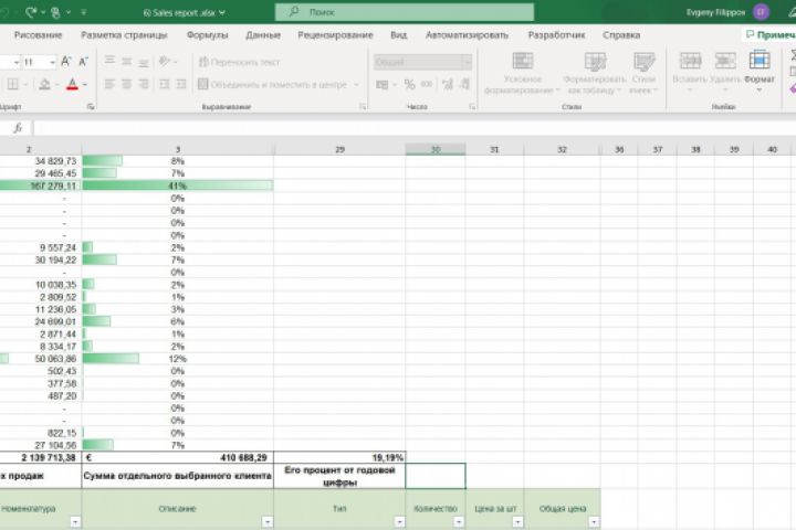 Отчет по продажам с возможностью выбора конкретного клиента для просмотра детальной информации.