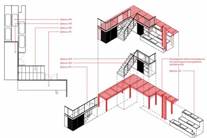 Рабочка офиса в несколько уровней-где заказчику необходимо было выполнить много чертежей каркасных конструкций и мебели. Так же бывают случаи где необходимо выполнить дизайн без визуализации-что мы тоже делаем. Мы выполняем чертежи одновременно с 3д моделью (с помощью Revit) что позволяет быстро делать графичные и понятные схемы и перспективные виды