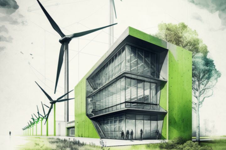 красочный дом в пасмурной погоде, и работающими мельницами позади