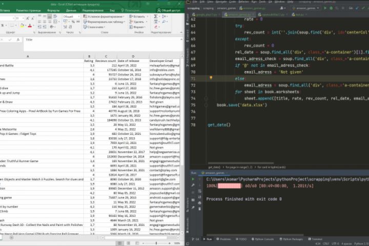 Сбор информации мобильных игр с амазона(название, рейтинги, кол-во отзывов, дата релиза, почта разработчика)