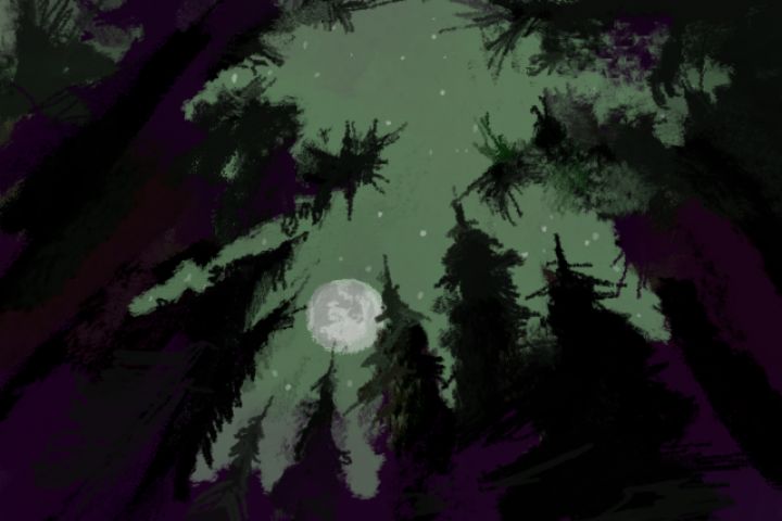 Милая иллюстрация ночного леса. Картина прекрасно передаёт ночную прохладу, тишь и уют.