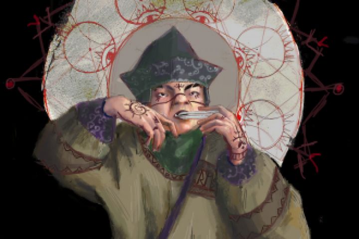 Необычная иллюстрация, на ней изображён монгол, играющий на варгане. Человек одет в национальный костюм. На фоне расположен круг из глаз, наблюдающих за музыкантом.