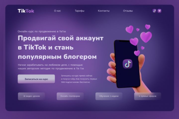 Разработан лендинг для онлайн-курса по продвижению в ТикТок. Использованы такие приложения, как фотошоп, фигма и тильда.