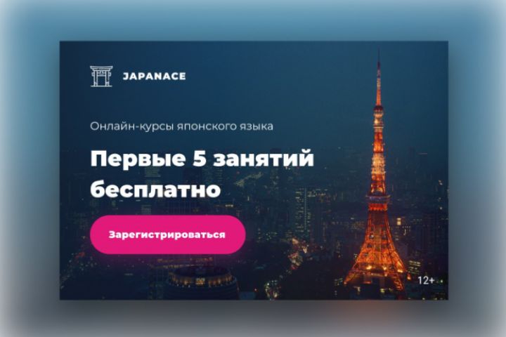Баннер для сайта по изучению японского языка. Выполнено в Figma. Размер: 600x400px.