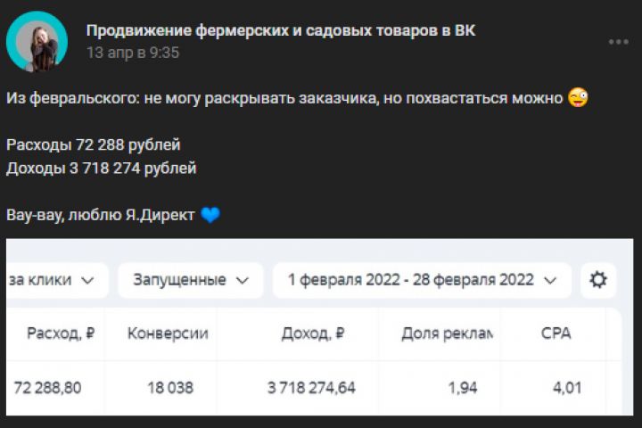 На протяжении полутра лет веду рекламу аптек в Директ. Бывают нормальные периоды по заказам, а бывают хорошие. Траты, в основном, около 50-80 т.р. Доходы по Директ - не менее 2 млн.
