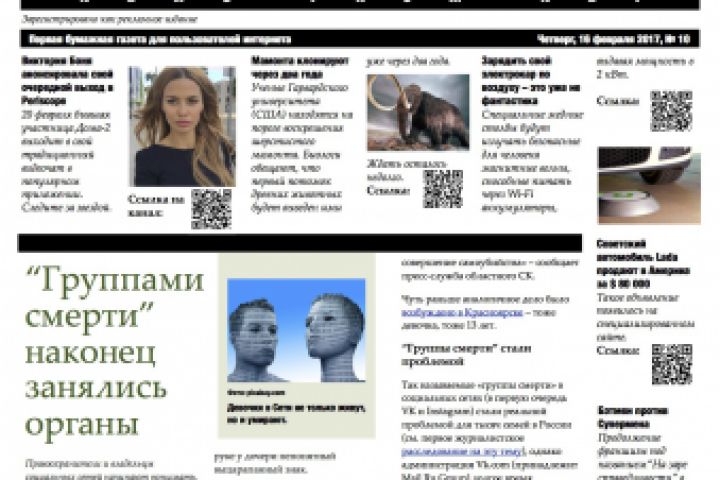 Идея бесплатной ежедневной печатной газеты для распространения в метро и в местах массового скопления людей с анонсами самых интересных новостей и статей, видео-контента и новинок компьютерных игр из Интернета "Газета Интернета" или "Web Газета" или "WebPaper" с QR-кодом на каждом анонсе для считывания мобильным телефоном и переходом непосредственно на источник в интернете.