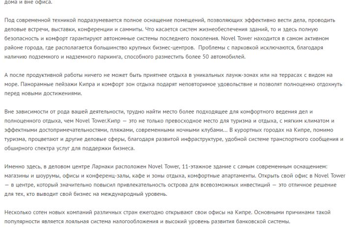 Именно здесь, в деловом центре Ларнаки расположен Novel Tower, 11-этажное здание с самым современным оснащением: магазины и шоурумы, офисы и конференц-залы, кафе и зоны отдыха, комфортные апартаменты. Открыть свой офис в Novel Tower — в центре, который значительно повысил привлекательность острова для всевозможных инвестиций — это отличное решение для тех, кто выводит свой бизнес на международный уровень.