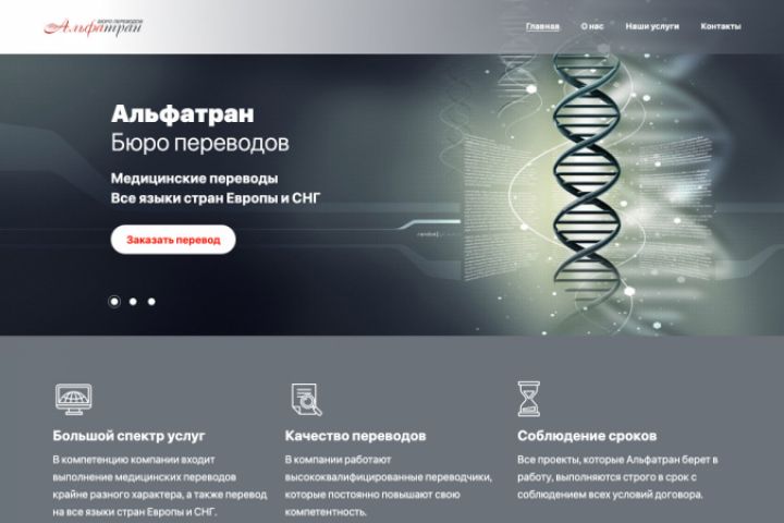 Сайт для международного бюро переводов. Сайт написан на html, css, js и не более того. Очень быстрый и стильный, а также весьма функциональный.