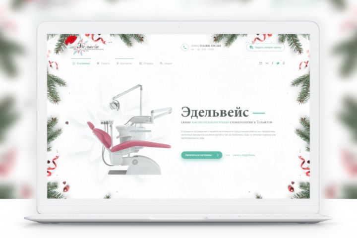 Заказчик попросил оформить первый экран сайта стоматологической клиники "Эдельвейс" на разные праздники: 1) Новый год 2) 23 Февраля 3) 8 марта 4) 9 мая 5) День защиты детей 6) 1 сентября 7) День рождения клиники