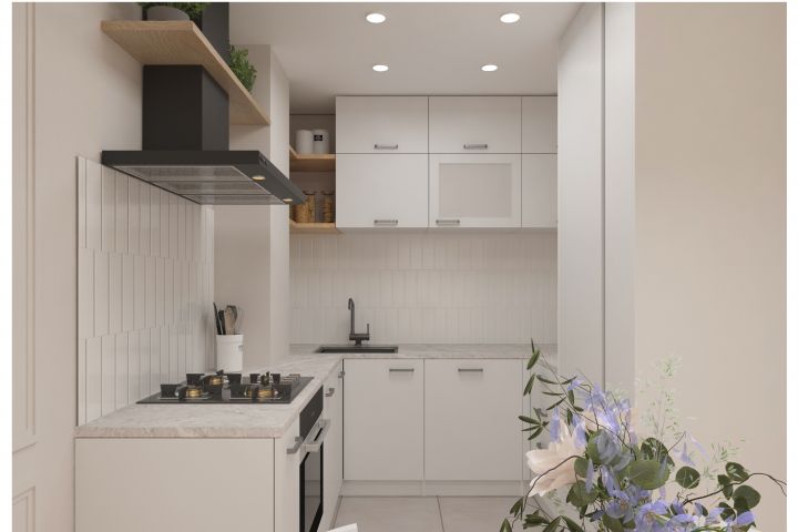 задача-сохранить и разместить имеющейся кухонный гарнитур и вписать в новый интерьер