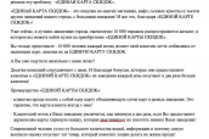 «ЕДИНАЯ КАРТА СКИДОК» - это покупки во многих магазинах, кафе, салонах красоты и тысяче других заведений нашего города, с большими скидками! И все это, благодаря «ЕДИНОЙ КАРТЕ СКИДОК»!