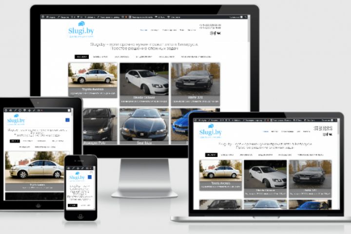 Slugi.by – это компания, которая предлагает услуги в сфере аренды автомобилей. Компания предлагает большой ассортимент автомобилей разной модификации: легковые автомобили, микроавтобусы, внедорожники и многое другое. У компании большой стаж и хорошие отзывы. Для такой компании было принято решение разработать корпоративный сайт, а также + разработать квиз.