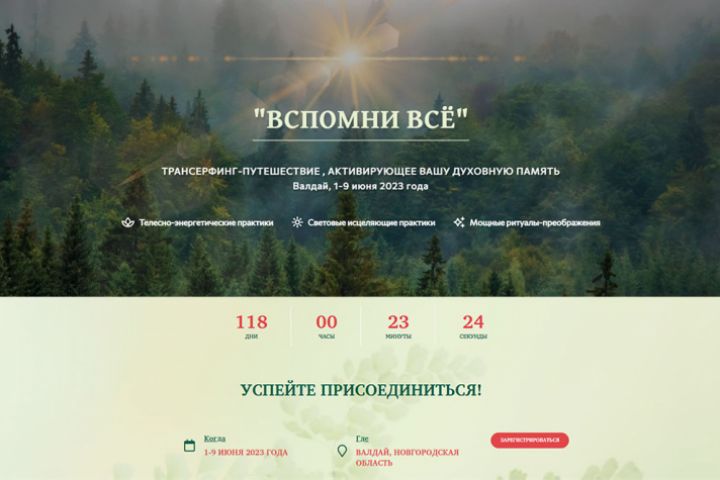 Рекламный лендинг путешествия на Валдай, в котором отражена программа, информация о проживании + реализована возможность забронировать участие.
