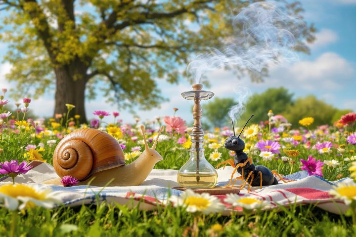 На солнечной поляне, где цветы расцветали в полную силу и ветер шептал сказки старых деревьев, Улитка и Муравей решили отдохнуть от своих повседневных забот. Они устроились на траве, разложив покрывало и достав кальян. Дымок от табака медленно вздымался в воздух, смешиваясь с ароматами цветов.