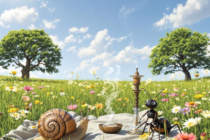 На солнечной поляне, где цветы расцветали в полную силу и лёгкий ветер шептал сказки старых деревьев, Улитка и Муравей решили отдохнуть от своих повседневных забот. Они устроились на мягкой траве, разложив покрывало и достав изящный кальян. Дымок от благовоний медленно вздымался в воздух, смешиваясь с ароматами нежных цветов.