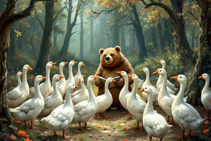 Мораль? Лесная наука сурова: если медведь учит гусей летать — проверь, не стоит ли за его спиной лиса с вилкой.