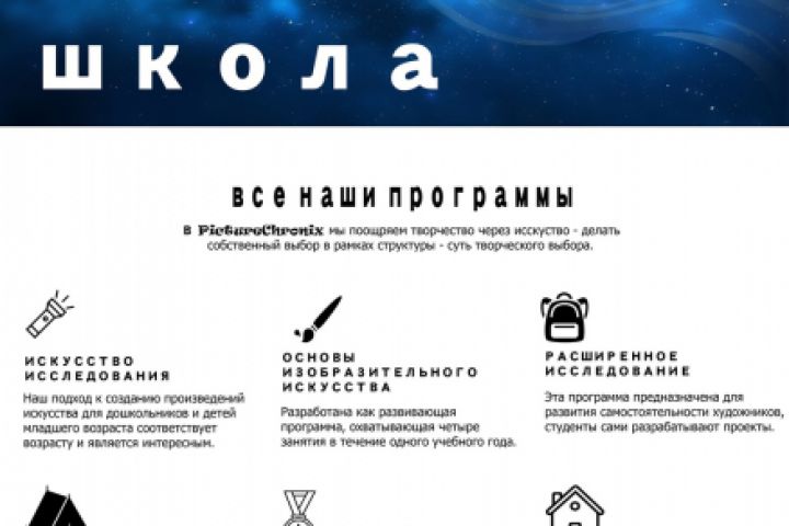 Оформление сайтов - это самое трудное, но интересное. Проект называется PictureChronix - это школа изобразительно искусства. Ваш ребёнок любит рисовать? Тогда вам точно в школу рисования PictureChronix. У школы развитая программа обучения.