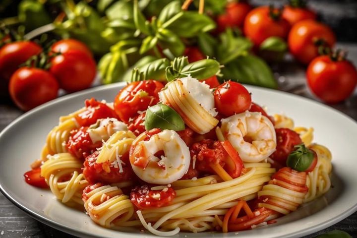 Вы профессиональный фуд-фотограф и фуд-стилист, создайте исключительно реалистичную фуд-фотографию с помощью sony alpha 7 в высоком разрешении 8000K пасты с креветками в томатно-чесночном соусе, украшенной листьями базилика, маленькими шариками белого сыра моцарелла, помидорами черри, сыром пармезан