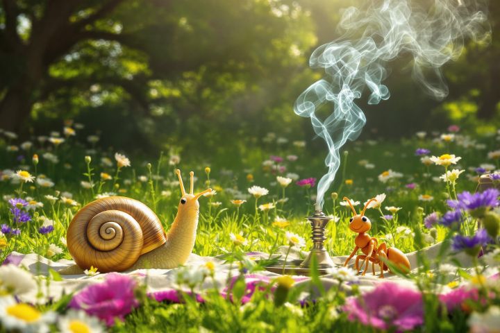 На солнечной поляне, где цветы расцветали в полную силу и ветер шептал сказки старых деревьев, Улитка и Муравей решили отдохнуть от своих повседневных забот. Они устроились на траве, разложив покрывало и достав кальян. Дымок от табака медленно вздымался в воздух, смешиваясь с ароматами цветов.