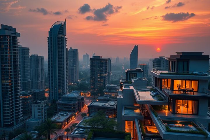 A high-end luxury apartment skyline in India at sunset, showcasing modern skyscrapers, premium villas, and high-rise penthouses with elegant lighting. The scene reflects wealth and exclusivity, with a panoramic view of Mumbai or Delhi's upscale real estate. Luxury cars, rooftop terraces, and private pools add to the premium feel. A subtle overlay of data visualization elements (rising graph, percentage growth, upward trend arrows) represents the booming market demand. Ultra HD, cinematic lighting, and sharp details to emphasize grandeur and exclusivity.