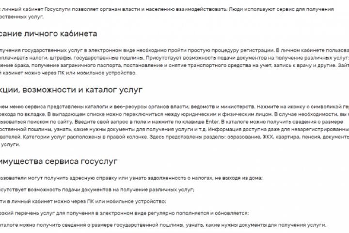 Для получения государственных услуг в электронном виде необходимо пройти простую процедуру регистрации. В личном кабинете пользователи могут оплачивать налоги, штрафы, государственные пошлины. Присутствует возможность подачи документов на получение различных услуг: заключение брака, получение заграничного паспорта, постановление и снятие транспортного средства на учет, запись к врачу и другие. Зайти в личный кабинет можно через ПК или мобильное устройство.