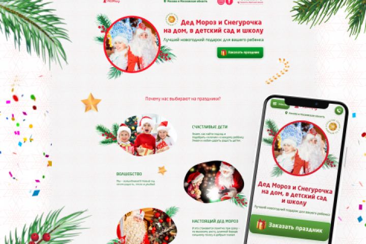Готов лендинг для компании, занимающейся организацией новогоднего визита Деда Мороза и Снегурочки.