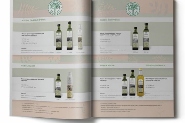 Каталог натурального оливкового масла. Природный стиль, на тот момент был трендовым. Детали растения. Пастельные цвета. Минимализм.