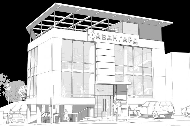 Скетч двуэтажного магазина с парковочными местами на цокольном этаже