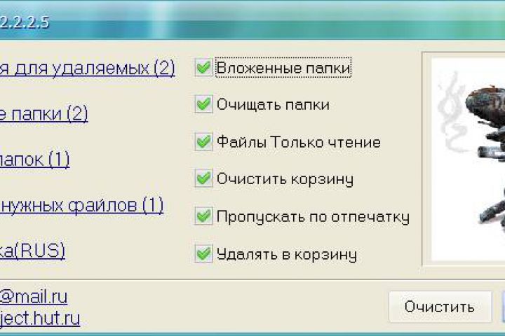 Удаление временных и/или ненужных файлов Отличием этой утилиты от других - является полный контроль настройки удаляемых файлов. Есть возможность установить "отпечаток" нужного файла, если он вдруг будет находится в удаляемой папке