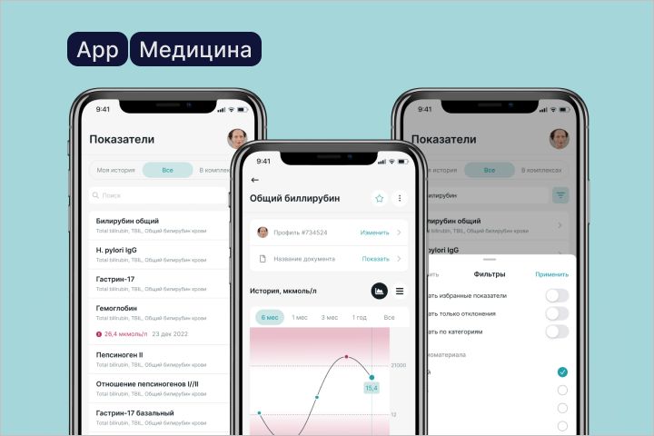 – Дашборд с последними анализами, рекламные баннерами от клиник, списком задач, уведомления