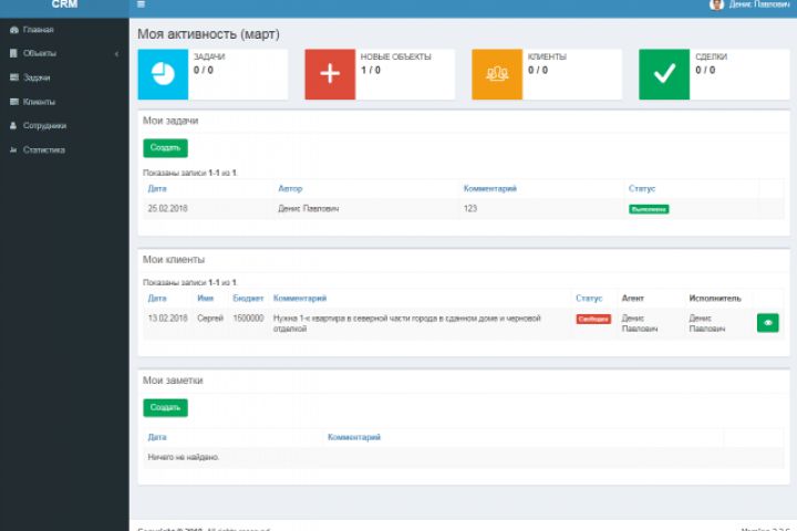 Управление клиентами Управление объектами Менеджер задач Контроль выполнения, статистика Находится в стадии наращивания функционала