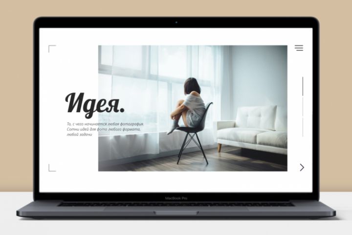 Любое фото начинается с идеи. Должно быть хотя бы представление о том, что ты хочешь снять, и именно вокруг этой мысли и проектировалась страница. Рамки в левом верхнем и левом нижнем углах отсылают к ассоциациям с процессом съемки, фотографирования, тем самым напоминая пользователю, с кем он имеет дело, заходя на сайт.