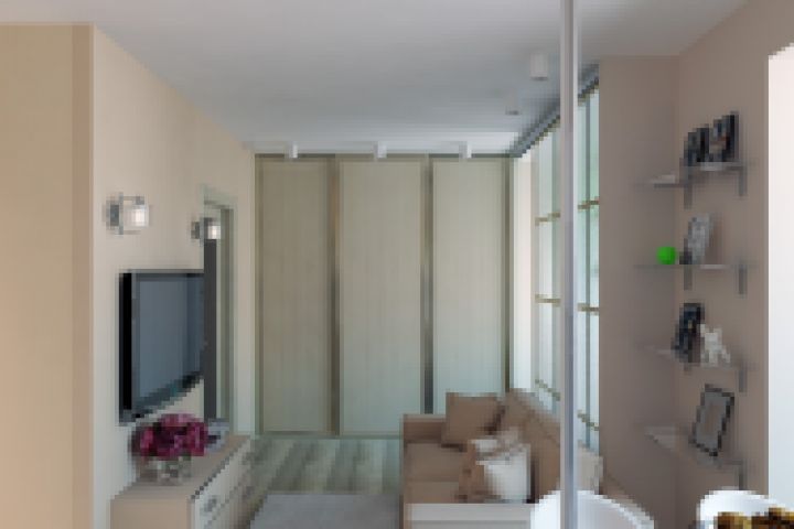 Перепланировка однокомнатной квартиры. Объединение балкона и кухни с гостиной, выделение спальной зоны раздвижными перегородками, Отдельная гардеробная комната.
