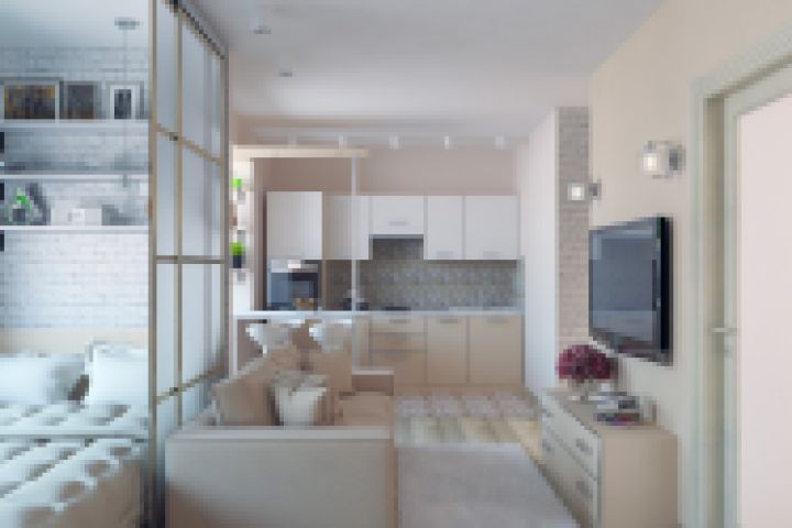 Перепланировка однокомнатной квартиры. Объединение балкона и кухни с гостиной, выделение спальной зоны раздвижными перегородками, Отдельная гардеробная комната.