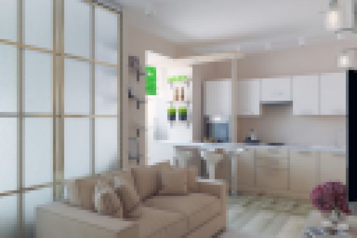 Перепланировка однокомнатной квартиры. Объединение балкона и кухни с гостиной, выделение спальной зоны раздвижными перегородками, Отдельная гардеробная комната.