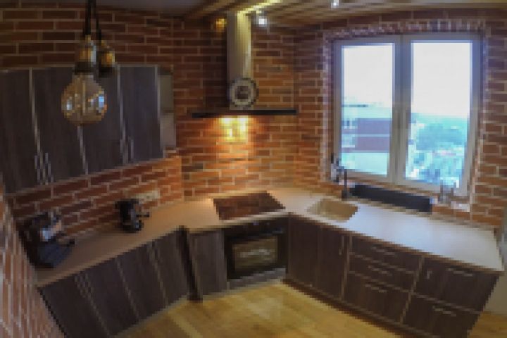 Квартира- студия для холостяка в стиле лофт. Кухня. Брус на потолке со скрытым освещением, точечные светильники, кирпич на фартуке, мойка у окна.