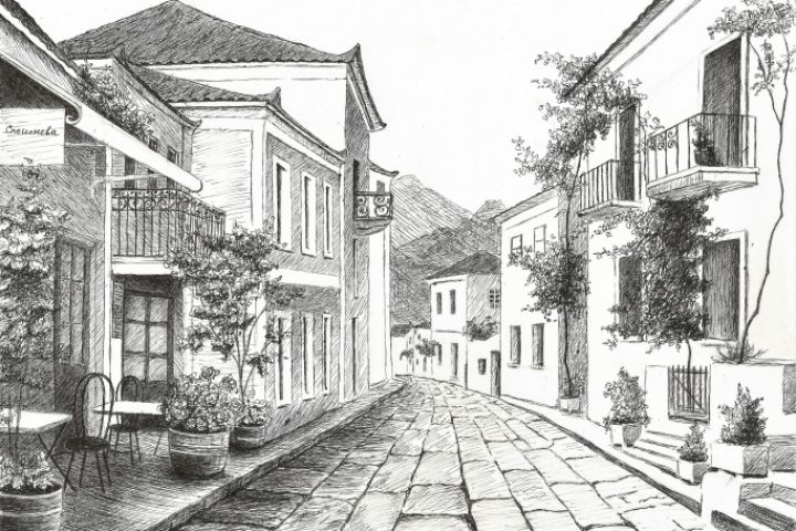 Ремейк акварельной работы П.Зографоса "Приморский городок". Гелевая ручка, бумага