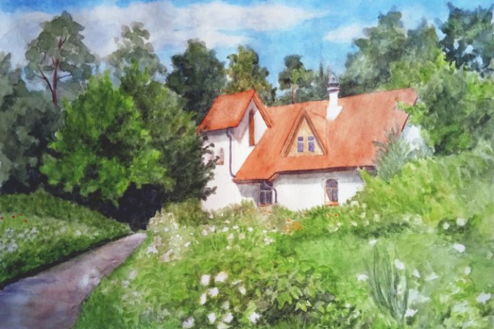 Пейзаж с домом. Бумага, акварель. Формат А3