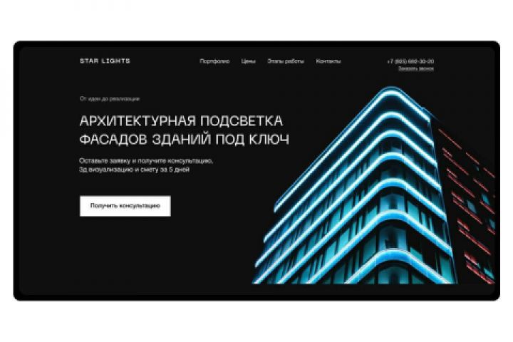 Разработать дизайн лендинга для компании STAR LIGHTS, которая предоставляет услуги по освещению фасадов зданий. Нужно было показать как красиво, дорого и привлекательно выглядят здания с подсветкой. А так же закрыть пользователя на получение консультации и предварительном просчёте проекта.