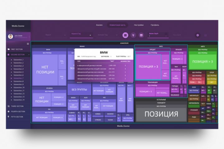 Требовалось разработать стильный, удобный UI/UX интерфейс для сервиса Media Zoome. Данные должны были быть представлены в виде карты Treemap и древовидной схемы. Вообщем полный функционал для управления картами и схемами, их рендеринг, настройки и сохранение.
