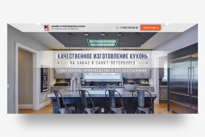 Необходимо было разработать первый экран для Landing Page. Компания изготавливает кухни на заказ.