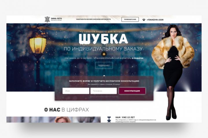 Необходимо было разработать Landing Page по заказу индивидуального пошива шуб для мехового Ателье Зима Лето. Цель Landing Page - сбор заявок на ответный звонок. Аудитория -женщины от 30 до 50 лет