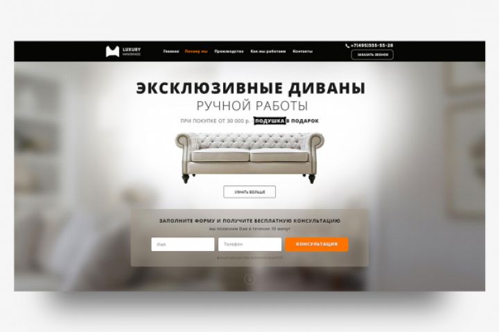 Необходимо было разработать первый экран для Landing Page по продажам эксклюзивных диванов на заказ.