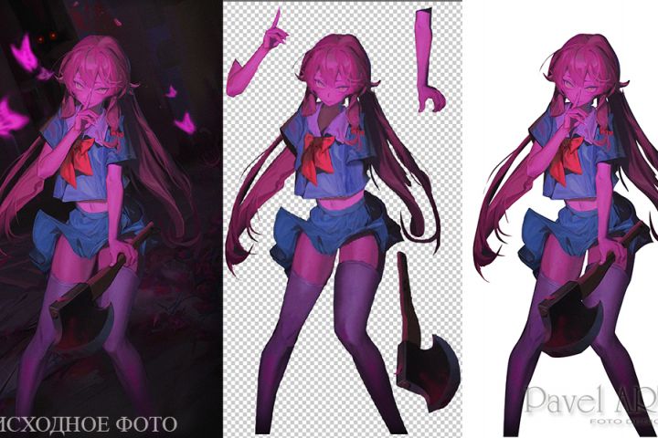 Обработка фото иллюстрации. Дорисовка недостающих частей тела и предметов(Лицо,Шея,Нога,Живот,Топор,Юбка,Майка и т.д) Обтравка и разделение по слоям.