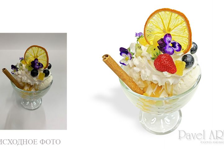 Пищевая продукция 3. Подготовка фото десерт. Обтравка, смена фона, замена элементов, коррекция свет, тени и создание реалистичной тени от объекта.