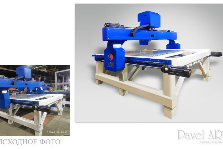 Обтравка станка плазменной резки. Ретушь. Создание реалистичной тени. Изготовление презентабельного фона. Дорисовка недостающих элементов. Наложение логотипа.