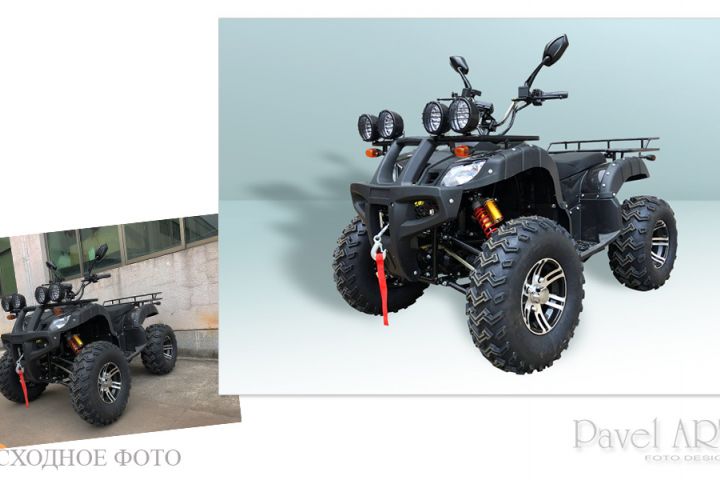 Обтравка квадроцикла, создание реалистичных теней, коррекция, свет-тени-контраст, изготовление презентабельного фона.
