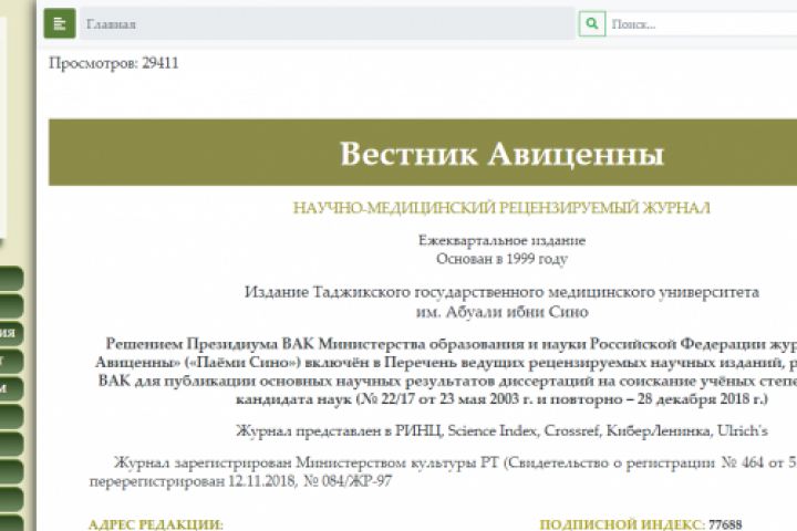 Вестник Авиценны» является официальным изданием Таджикского государственного медицинского университета имени Абуали ибни Сино и имеет статус научно-медицинского рецензируемого журнала.