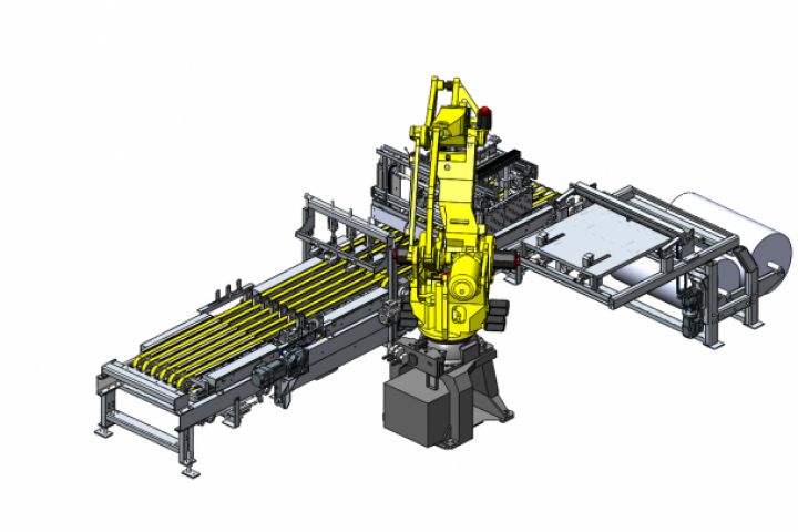 Линия состоит из двух ленточных конвейеров, подъемных столов, кантователя, передвижных упоров, грейферных захватов, бумагорезки.