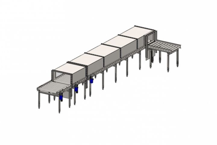 Шиберный приводной конвейер предназначен для транспортирования тары размером 670х480х300мм и температуре деталей в ней до 85 С.
